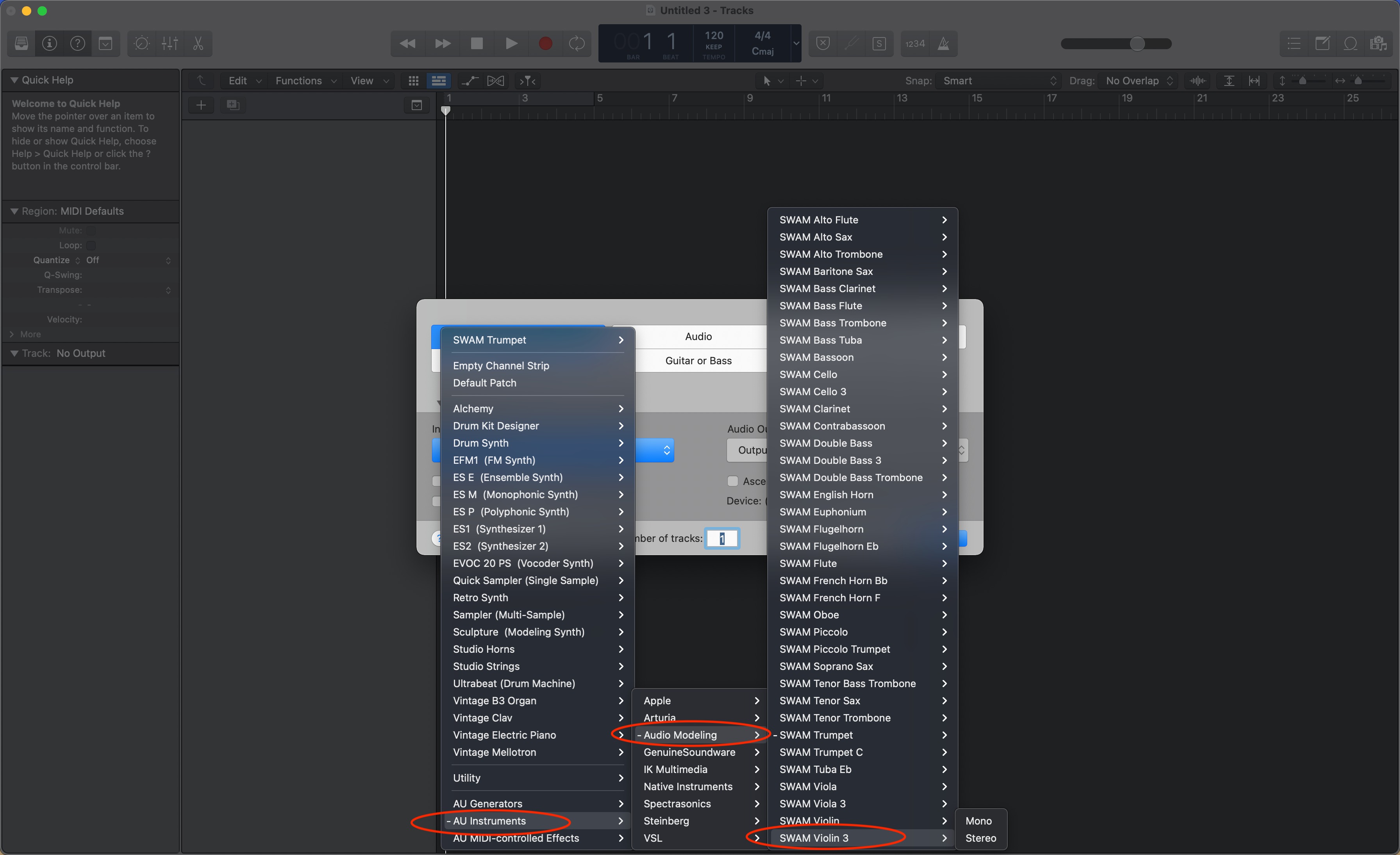 - Add a Software Instrument Track. From the Instrument dropdown menu, click on AU instruments>Audio Modeling and select the wanted SWAM instrument. Choose mono or stereo depending on whether you want to create a mono or stereo track. (Pictures 2 & 3)