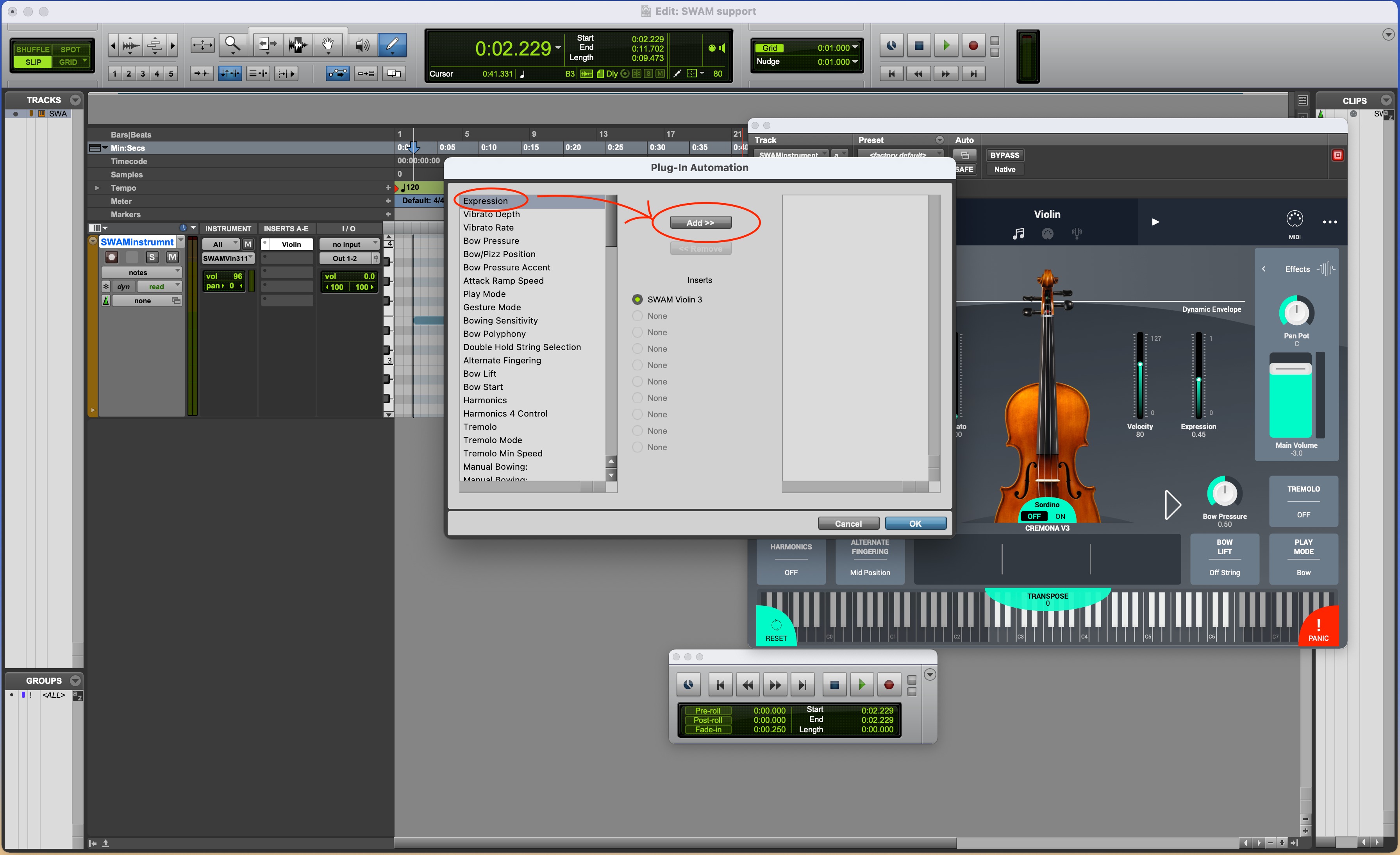 - To automate the Expression parameter (only for SWAM Brass and SWAM Strings v3.x), open the SWAM instrument interface and click on the Plug-In Automation button at the top. Select and add Expression to the parameters list. Select Expression from the automation track dropdown menu under the SWAM instrument's parameters list. (Picture 6, 7, 8 & 9)