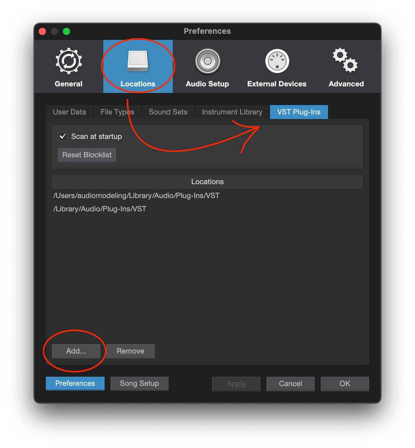- Select Locations and then click the VST Plug-Ins tab. In the VST location list, make sure to have the correct VST and VST3 SWAM instruments path (if not, press the Add button and browse the right paths) (Picture 2).