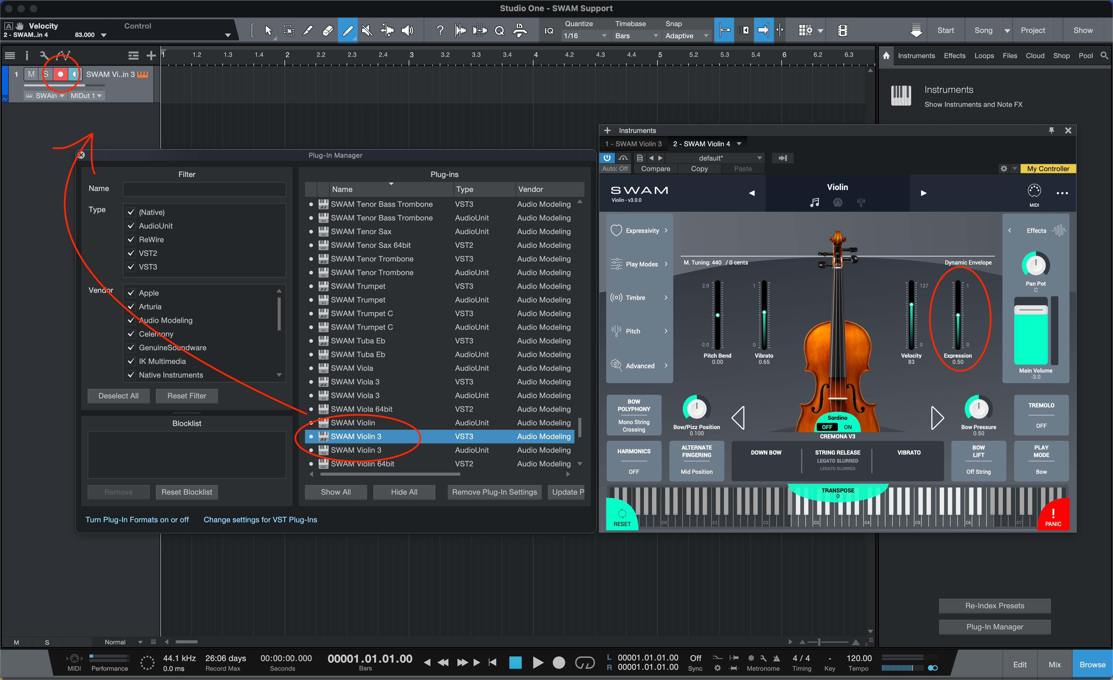 - Add a SWAM instrument track. Open the Plug-in Manager from the view dropdown menu (or press the button on the bottom of the right sidebar). Drag and drop the wanted SWAM instrument into the timeline to directly create a SWAM instrument track. Make sure to have your track armed (track Rec button enabled). Then, move the expression controller to play your SWAM instrument. (Pictures 4 & 5)