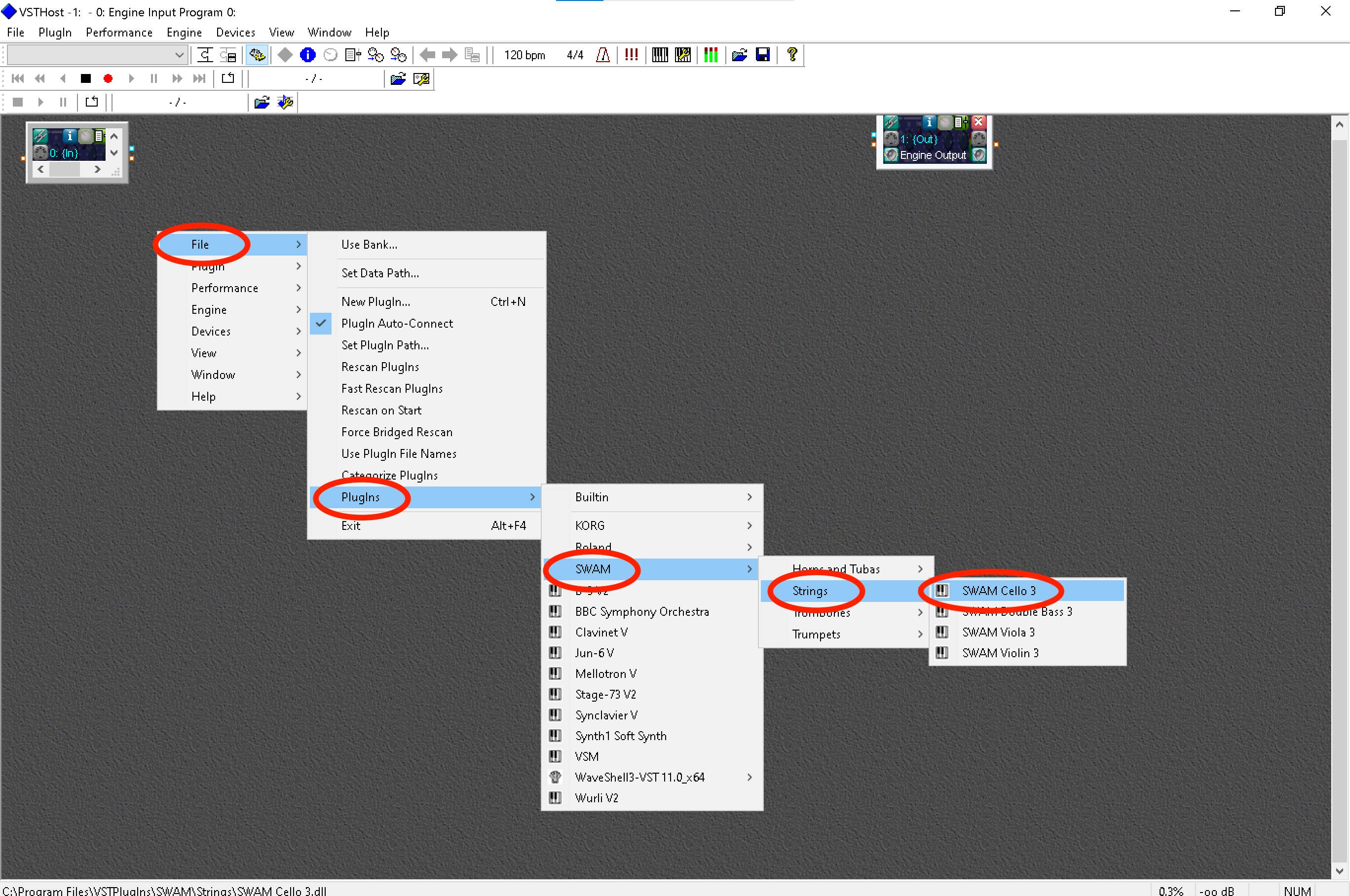 - Add a SWAM Instrument by right-clicking on the main window. Select File -> Plugins -> SWAM and select your favorite SWAM instrument. (Picture 3 & 4)