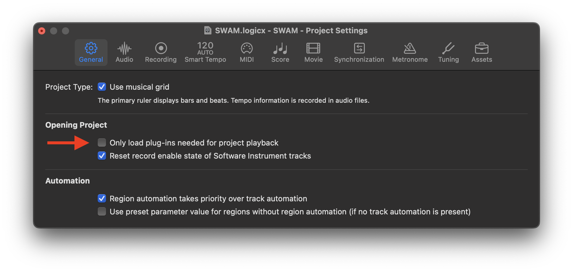 By disabling the "Only load plug-ins needed for project playback" option, Logic Pro will load all plugins upon project startup, ensuring that all SWAM instruments can communicate with the Ambiente Room Simulator immediately.