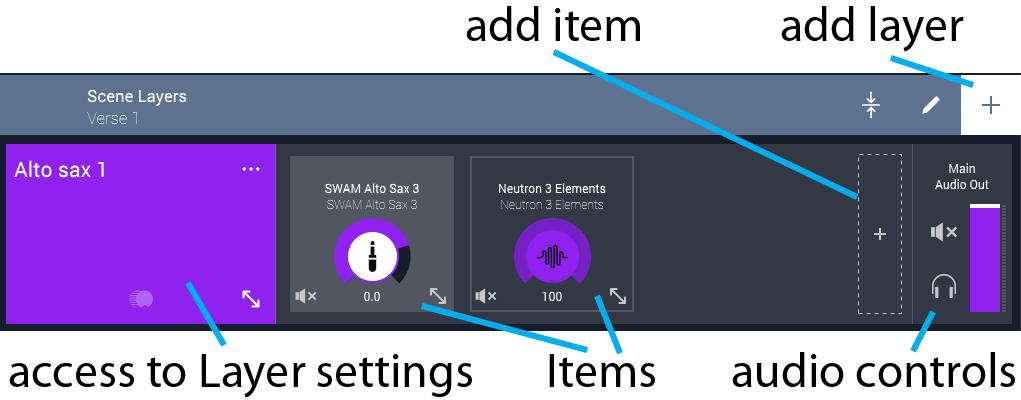 Her SWAM Alto Sax needs a Layer to live in, so Wendy clicks the Layers button in the footer to bring up the Layers view. She clicks the plus sign (+) on the right end of the Scene Layers banner to create and name a new Layer. The box on the left of the Layer is where Layer Settings are accessed (and some of them displayed), and on the right are audio controls, but Wendy clicks the plus sign (+) in the box just to the left of the audio controls to add an Item, which, in this case, is the SWAM Alto Sax. Although the SWAM instrument has some built-in processing, Wendy has a channel strip plugin she really likes, so she adds another item and assigns the channel strip to it.