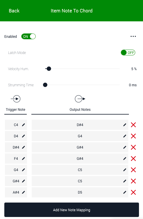 Figure 8 - Using the Note To Chord transformation, Wendy is able to generate any harmony she wants for each notes. This screenshot shows only slightly less than one octave, but each note across the entire range of MIDI could be specified individually.