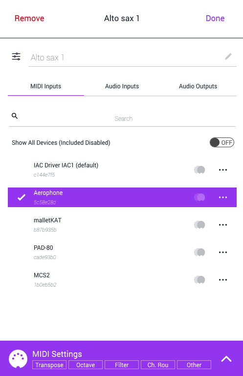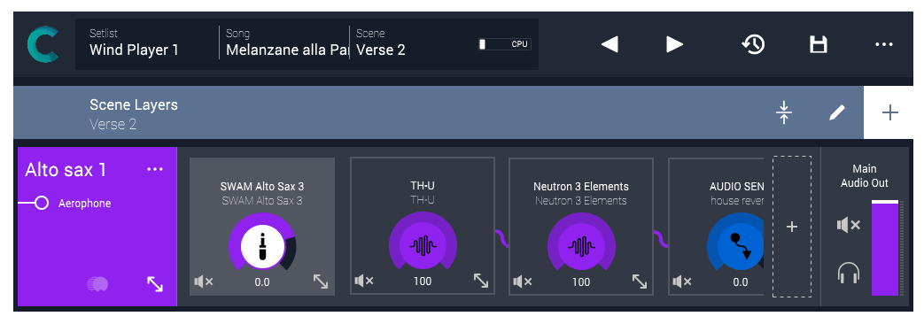Wendy has put together a great basic signal path for her first Scene, but she needs to play through it a little and tweak things until they’re just right, so it’s time to get her MIDI controller connected. As usual, there are several ways to do this, but she takes the most obvious path by clicking on the Layer settings box on the left of the Scene Layer, then selecting her MIDI wind controller as the MIDI input. She could choose the audio outputs on her interface that the Layer should use, but the Layer already defaulted to using her interface’s main audio outputs, and that’s fine with her. Wendy is now ready to play her first Scene and adjust it to her little heart’s content.