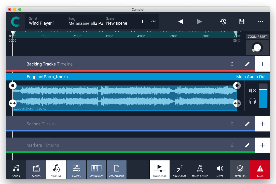 Now it’s time to load up the backing track for this song. Backing tracks and automation are both handled in Camelot’s Timeline view, so we click the Timeline at the bottom of the Camelot window.