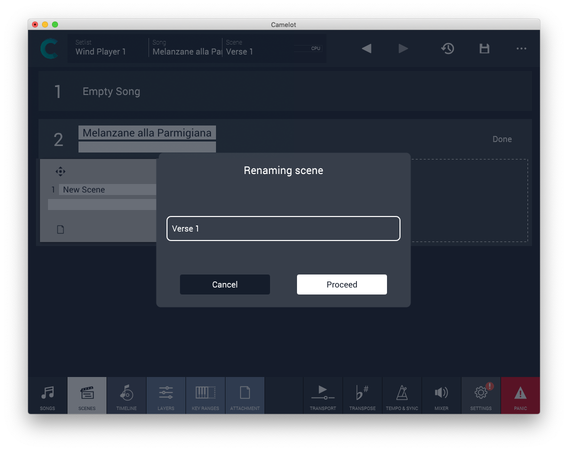 She could make a new Scene from the main menu wizard in the same way that she made the Setlist and Song, but Camelot often offers several different ways to accomplish the same task, so she chooses to use another approach. She clicks the Scenes button in the footer to bring up the Scenes view, clicks the name of the empty Scene that is in the Song by default, and renames it “Verse 1.”