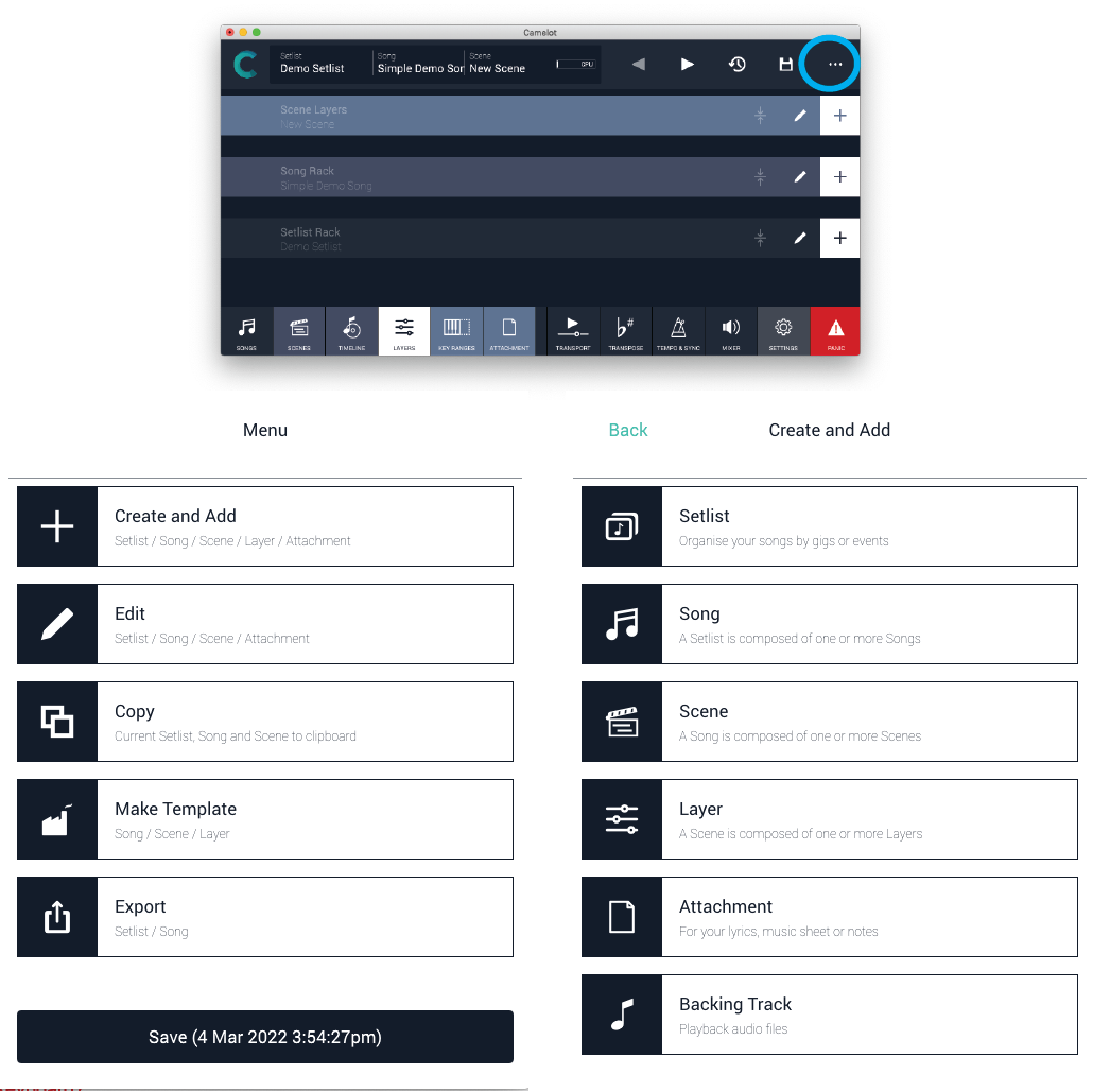 Wendy first needs to make a new Setlist, the document which is Camelot’s top level or organization. This will be the canvas on which her entire Camelot setup will be based. The “three dots” icon (“…”) in the upper right corner brings up the main menu wizard that guides her through access to Camelot’s primary functions, including creating, editing, and copying Setlists, Songs, Scenes, and Layers. Wendy goes to the main menu wizard, creates a new Setlist, and names it.