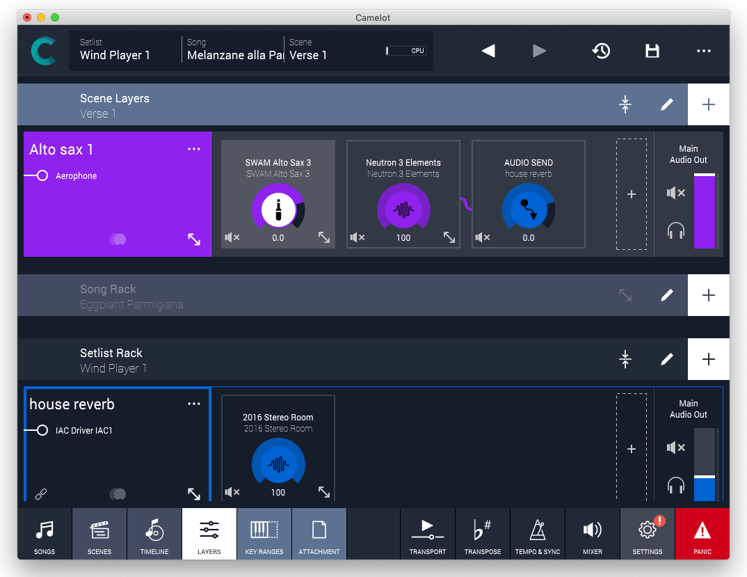 She could just insert the reverb on the Layer she’s got going and in each of the other Scenes she’s going to create, but Camelot offers a better alternative. The Song Rack and Setlist Rack are spaces that also can hold Layers containing Items, but they remain the same through every Scene change. As you might have guessed, the Song Rack stays the same until the Song is changed, and the Setlist Rack stays the same as long as that Setlist is in use, which is what Wendy wants. Putting her reverb in the Setlist Rack also means that it only gets loaded once, instead of having to be loaded for each scene.